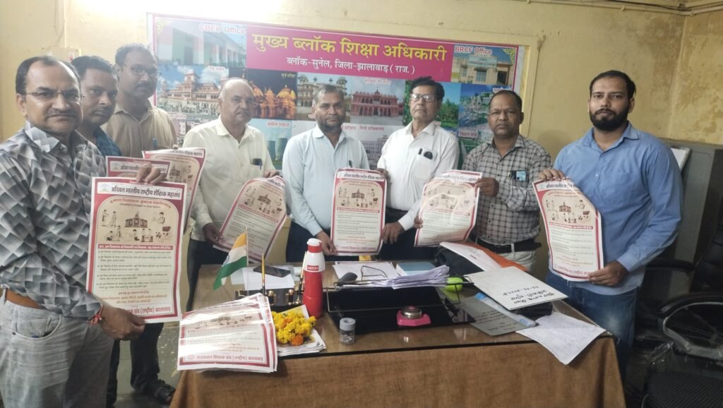 राजस्थान शिक्षक संघ राष्ट्रीय उप शाखा सुनेल ने अखिल भारतीय राष्ट्रीय शैक्षिक महासंघ द्वारा रचित “हमारा विद्यालय हमारा स्वाभिमान” कार्यक्रम के तहत आज मुख्य ब्लॉक शिक्षा अधिकारी सुनेल से कार्यक्रम के सफल आयोजन को लेकर संवाद किया साथ ही कार्यक्रम का पोस्टर विमोचन किया। उप शाखा अध्यक्ष हेमराज पांचाल ने बताया कि इस अवसर पर संपूर्ण भारतवर्ष में 5 लाख विद्यालयों में 1 सितंबर 2025 को शिक्षक-शिक्षार्थी प्रार्थना सभा में निम्न बिंदुओं पर एक साथ शपथ लेंगे।