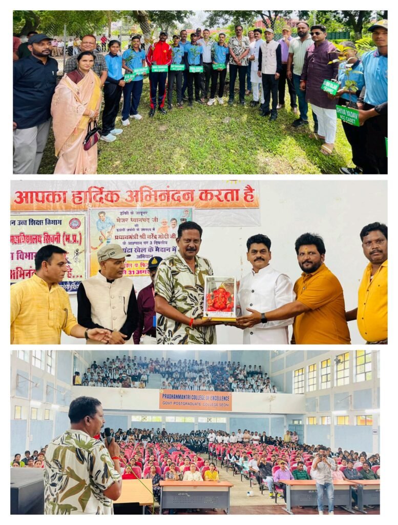 सिवनी। विधानसभा क्षेत्र के विधायक दिनेश राय मुनमुन के करकमलों से खेल मैदान का जीर्णोद्धार, दर्शक दीर्घा टीन शेड का भूमिपूजन एवं सामुदायिक भवन का लोकार्पण किया गया। निर्धारित कार्यक्रम के अनुसार सुबह 11 बजे विधायक जिला मुख्यालय सिवनी स्थित प्रधानमंत्री कॉलेज ऑफ एक्सीलेंस शासकीय स्नातकोत्तर महाविद्यालय पहुँचे। महाविद्यालय परिवार द्वारा भव्य स्वागत के उपरांत उन्होंने परिसर में स्थापित माँ भारती की प्रतिमा पर माल्यार्पण कर नमन किया।