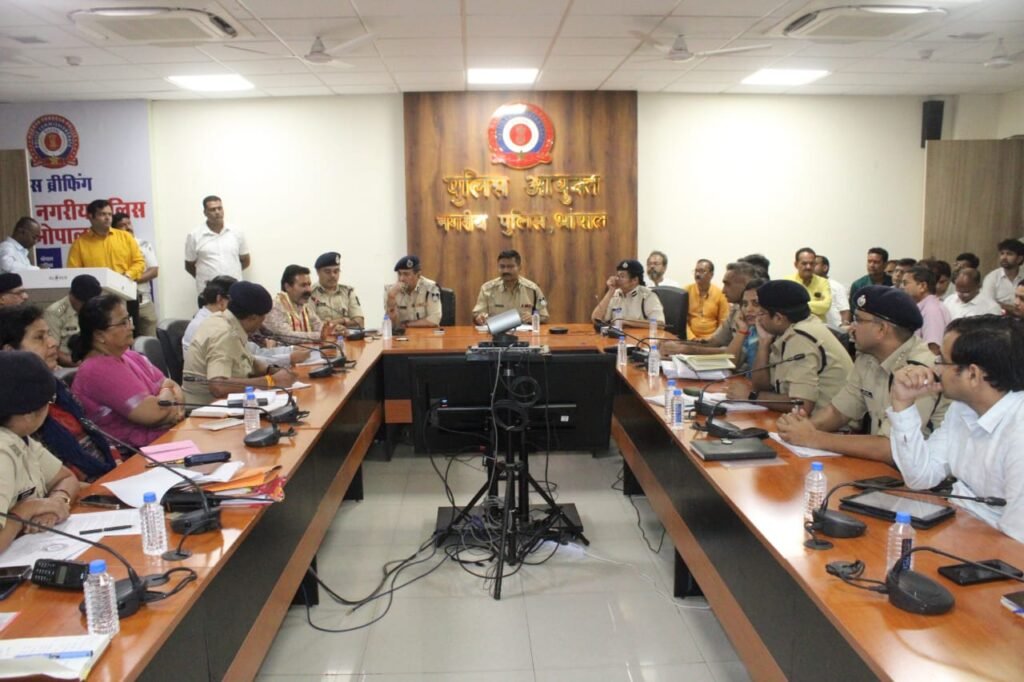 भोपाल: दिनाँक 28 सितंबर 2025- दुर्गाउत्सव गरबा रामलीला रावण दहन चल समारोह प्रतिमा विसर्जन के दौरान आमजन की सुरक्षा एवं शांति व्यवस्था के मद्देनजर पुलिस आयुक्त श्री हरिनारायणाचारी मिश्र द्वारा आज दोपहर कमिश्नर कार्यालय सभागार में पुलिस व प्रशासनिक अधिकारियों तथा हिन्दू उत्सव समिति की संयुक्त बैठक ली गई।