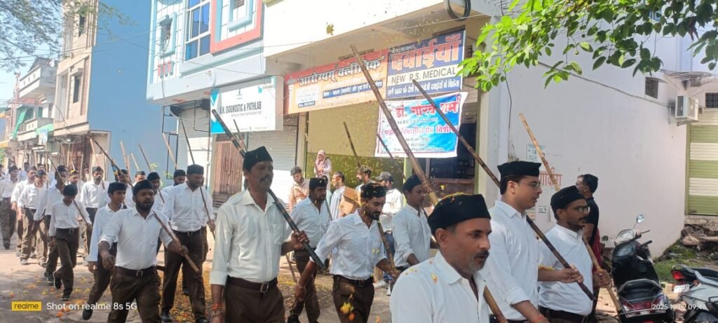राष्ट्रीय स्वयंसेवक संघ (आरएसएस) इस वर्ष अपना शताब्दी वर्ष मना रहा है। इसी कड़ी में विजयादशमी के अवसर पर विदिशा नगर में पथ संचलन का आयोजन किया गया। यह संचलन 2 अक्टूबर को एक साथ 8 बस्तियों में निकाला गया। राष्ट्रीय स्वयंसेवक संघ (आरएसएस) के स्वयंसेवकों ने विजयादशमी के अवसर पर देशभर में पथ संचलन निकाला। इसके साथ ही आरएसएस का स्थापना दिवस भी मनाया गया। विजयादशमी के मौके पर राष्ट्रीय स्वयंसेवक संघ विदिशा नगर ने भी मुख्य मार्गों पर पथ संचलन किया। इस दौरान फोटोग्राफर्स कल्याण समिति के साथ ही चेंबर ऑफ कॉमर्स से जुड़े व्यापारियों सहित अलग-अलग जगहों पर समाजसेवियों ने स्वयंसेवकों पर पुष्पवर्षा कर स्वागत किया। जिला प्रचार प्रमुख वीरेन्द्र रघुवंशी ने बताया कि 2 अक्टूबर को जिन 8 बस्तियों में पथ संचलन हुआ, उनमें रामलीला मैदान (सुदर्शन बस्ती), गल्ला मंडी बरईपुरा (गुरु गोविंद बस्ती), बालाजी मंदिर चोपड़ा (सरस्वती बस्ती), रायपुरा स्कूल (यमुना बस्ती), मुखर्जी पार्क (नर्मदा बस्ती), सरस्वती विद्यालय टीलाखेड़ी (कबीर बस्ती), गंगा मैरिज गार्डन (महावीर बस्ती) और रॉयल सिटी पार्क (रविदास बस्ती) शामिल हैं। सुदर्शन बस्ती वाले पथ संचलन में मुख्य अतिथि डॉ. अनिल शर्मा रहे। पथ संचलन के दौरान स्वयंसेवक भगवा ध्वज, वंदन गीत और घोष धुनों के साथ कदमताल करते हुए बस्तियों से गुजरे। शेष 12 बस्तियों में यह संचलन 5 और 12 अक्टूबर को आयोजित किया जाएगा। संघ पिछले कई दिनों से इस आयोजन की तैयारियों में जुटा था। स्वयंसेवक घर-घर जाकर लोगों से संपर्क कर रहे थे। नगर को 20 बस्तियों में बांटा गया है और 20 टोलियां लोगों को पथ संचलन से जोड़ने का प्रयास कर रही हैं। संघ का लक्ष्य था कि प्रत्येक घर से कम से कम एक व्यक्ति संघ की गणवेश पहनकर संचलन में शामिल हो। प्रत्येक वर्ष की तरह इस वर्ष भी पथ संचलन का जगह-जगह स्वागत एवं पुष्पवर्षा के साथ आयोजन किया गया।