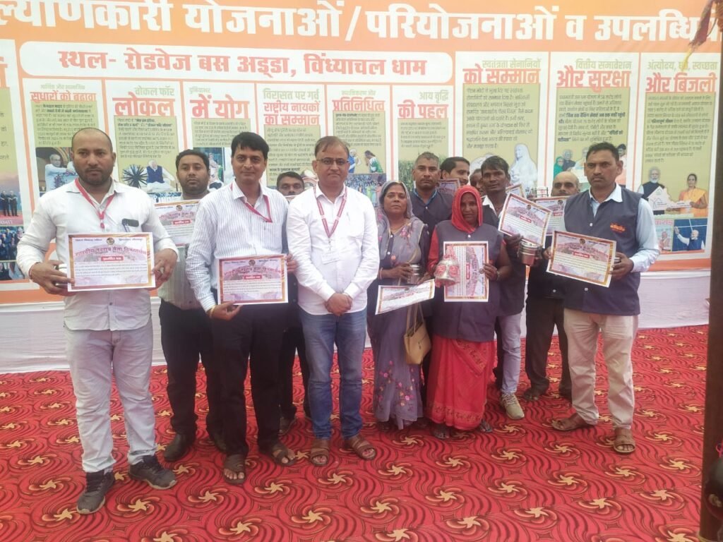 शारदीय नवरात्रि विंध्याचल पंचायती राज सम्मान समारोह के द्वारा सफाई कर्मचारियों को सम्मानित किया गया स्थान गोपालपुर स्वच्छ भारत मिशन विनोद कुमार श्रीवास्तव डी सी स्वच्छ भारत मिशन ग्रामीण संतोष कुमार डी पी आर ओ, प्रेमदास ए डी पी आर ओ, ए डी ओ पंचायत बृजेश सिंह ग्राम प्रधान भरत प्रसाद गोपालपुर सचिव राजेश गौतम सचिव मनोज यादव सचिव अनुराग सिंह सचिव दीपक त्रिपाठी दिलीप विश्वकर्मा पंचायत सहायक प्रीति साहनी पंचायत मित्र रामलाल बिंद