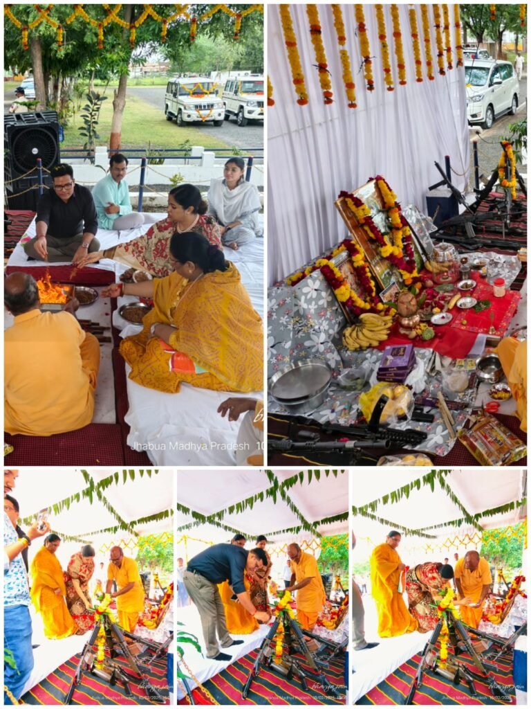 झाबुआ। विजयादशमी पर्व पर पुलिस लाइन झाबुआ में पारंपरिक शस्त्र पूजन कार्यक्रम का आयोजन किया गया। इस अवसर पर महिला एवं बाल विकास मंत्री सुश्री निर्मला भूरिया, कलेक्टर झाबुआ सुश्री नेहा मीना एवं पुलिस अधीक्षक श्री शिव दयाल सिंह ने विधिवत मंत्रोच्चार के साथ शस्त्र पूजन किया। पूजा उपरांत परंपरानुसार हर्ष फायर भी किया गया। इसी क्रम में जिले के सभी थाना एवं चौकियों पर भी शस्त्र पूजन संपन्न हुआ।